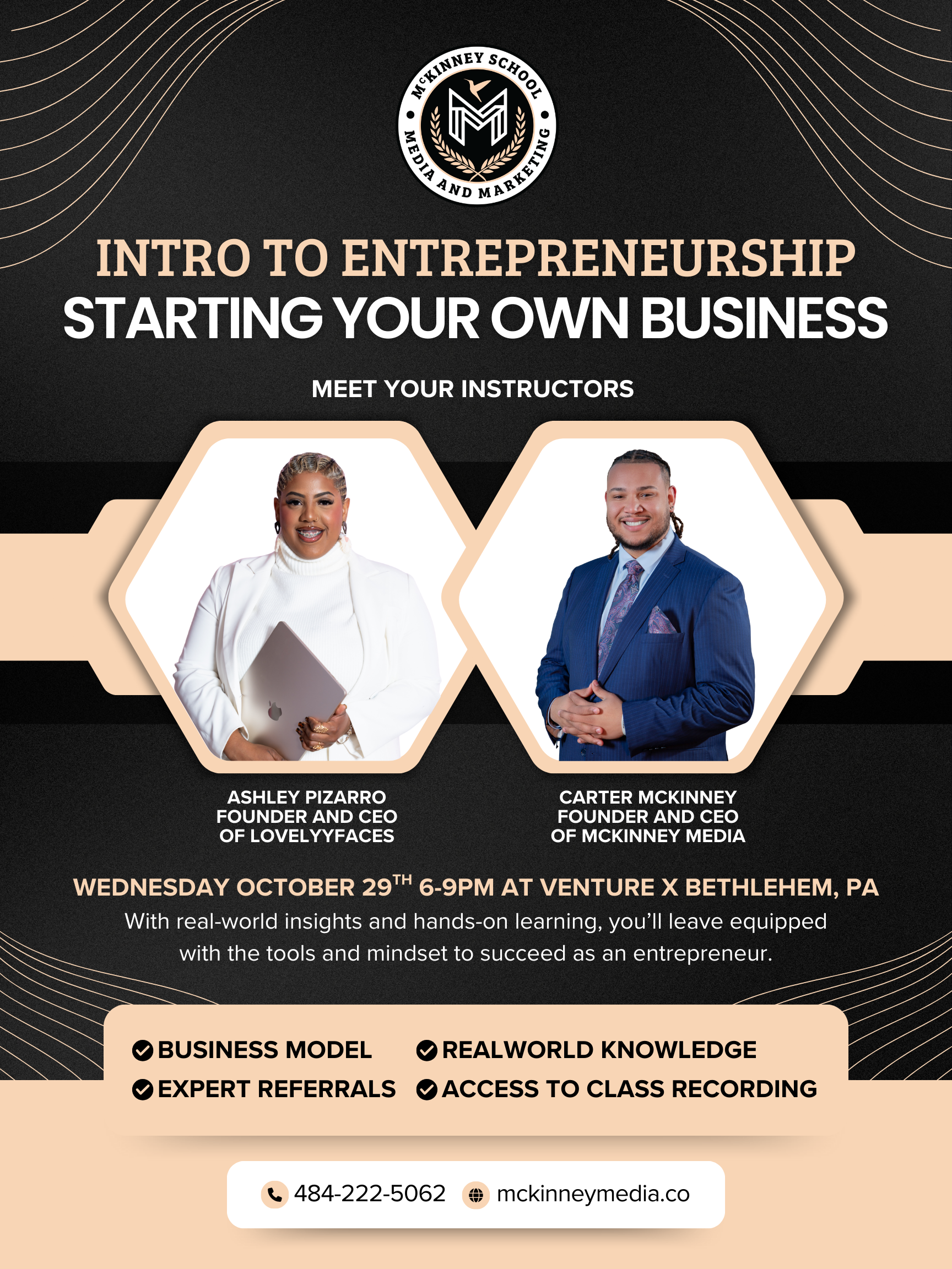 Join Carter McKinney (Founder & CEO, McKinney Media) and Ashley Pizarro (Founder & CEO, Lovelyyfaces Spa Lounge & Master Academy) for a transformative evening designed to help you build, brand, and grow your business.