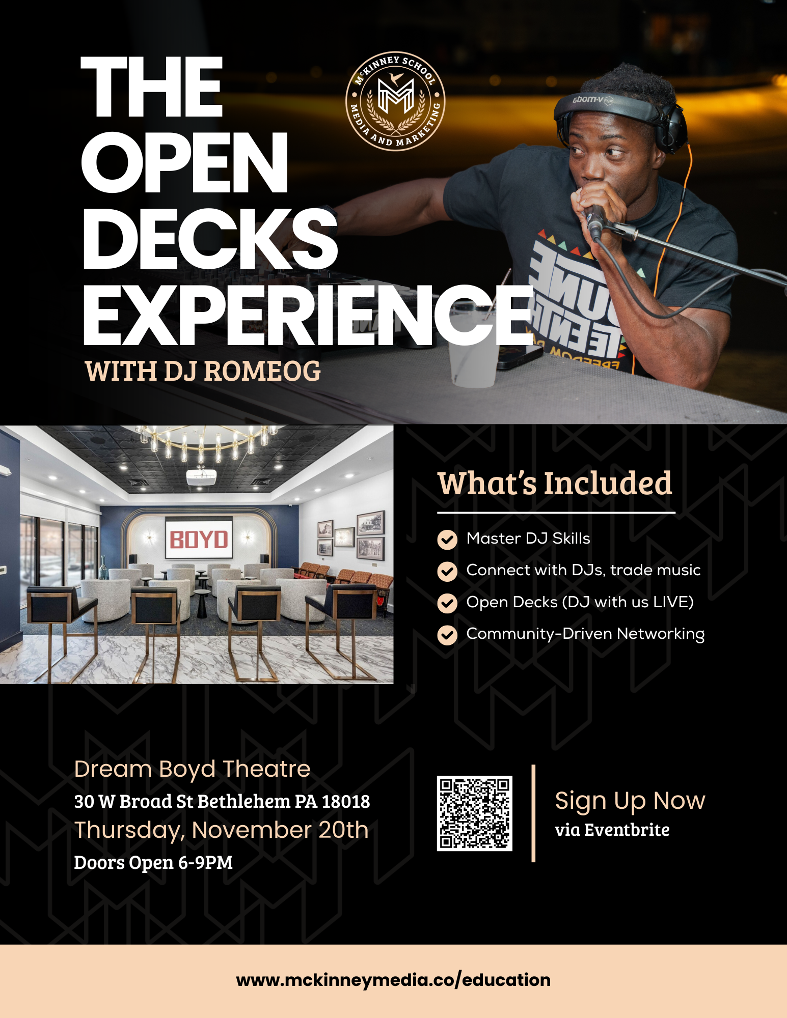Hosted by DJ RomeoG and powered by the McKinney School of Media & Marketing, this experience blends hands-on training, business insights, and community connection into one high-energy night.